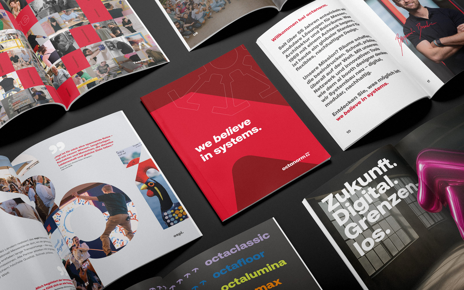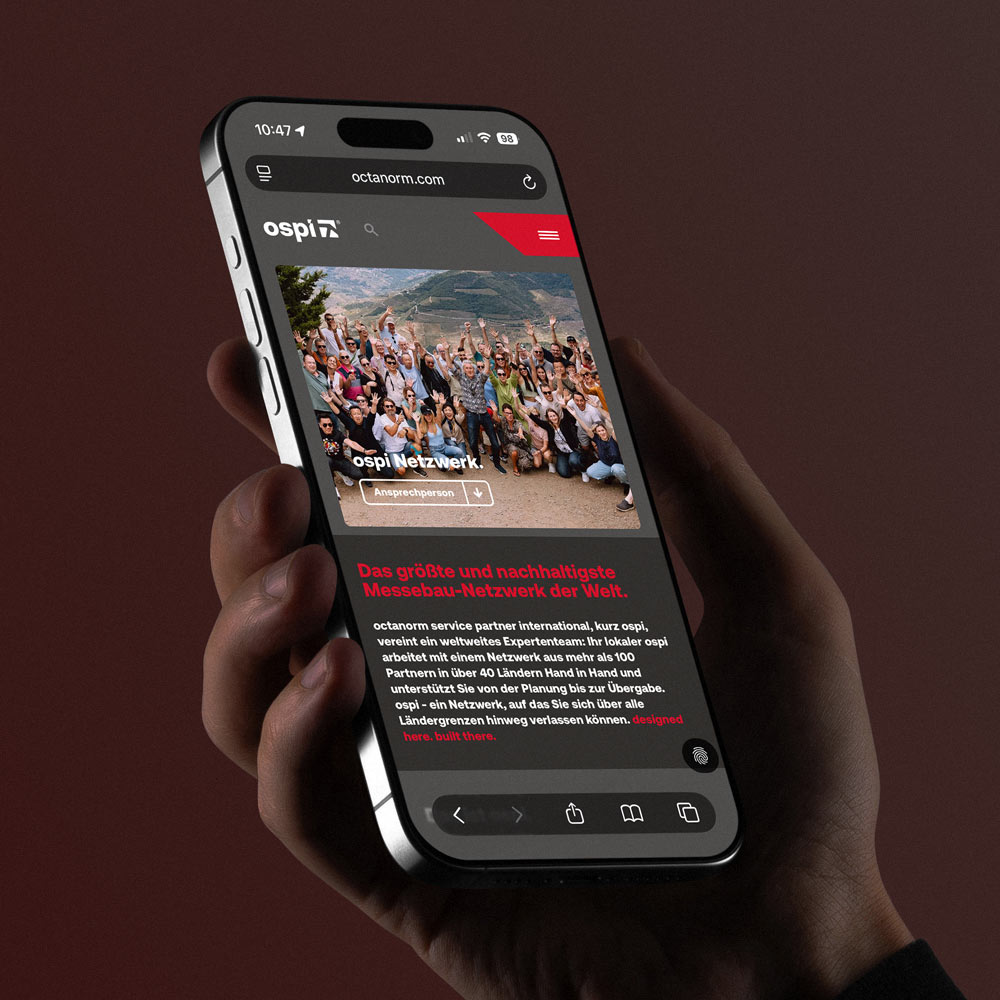 Das neue Corporate Design übersetzt die DNA von octanorm in ein klares System aus modularer Struktur, technischer Präzision und globalen Einsatzbereichen. Herzstück ist die von uns entwickelte octaform – ein Gestaltungselement, abgeleitet vom ikonischen S100-Profil. Sie rahmt Inhalte, gibt Struktur und sorgt für hohe Wiedererkennung. Ergänzt wird sie durch ein reduziertes Farbsystem, klare Typografie, ein feinjustiertes Logo und den Claim: we believe in systems.